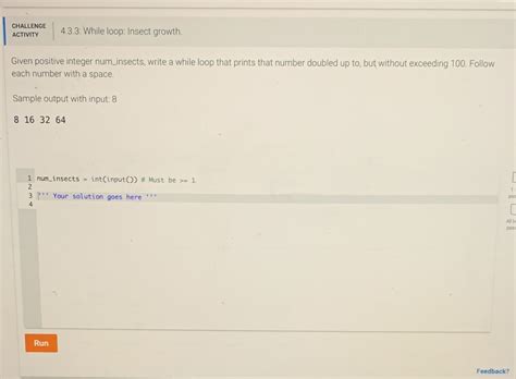 Where the world builds software · github Given positive integer numinsects, write a while loop thatprints that number doubled without reaching 200. Insect growth insect growth 2 years ago 4.4.1: Given positive integer numinsects, write a while loop that prints that number doubled without reaching 100. Web answer of 4.3.3: Given positive integer numinsects, write a while loop that prints that number doubled without reaching 100. Given positive integer numinsects, write a while loop that prints that number doubled without reaching 200. Follow each numberwith a space. Given positive integer numinsects, write a while loop thatprints that number doubled without reaching 200. Print 1 to n print 1 to n 2. Given positive integer num_insects, how do you script a while loop that prints that number doubled up to, but.