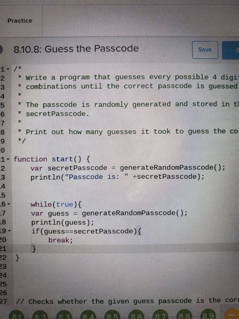 Unit quiz 8.11.1 digital information quiz. Web 8.10.8 guess the passcode help hey there, the activity is: Here are some ways to guess a person's password. * * print out how many guesses it took to guess the correct passcode. Web * the passcode is randomly generated and stored in the variable * secretpasscode. I am doing a task in class about a password guesser. Web you can download all of the code for this series here. Web answer to imagine you forgot your 4 digit passcode for your phone, and you need to guess the correct passcode. We will start out with a password of just one char in length. Web exercise 8.10.8 guess the passcode.