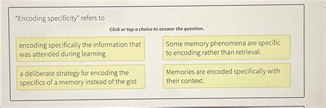 A) the discrete and specific links that occur in a collins and quillan network b) using physical surroundings or emotions as. Web encoding specificity refers to the tendency, when memorizing, to place in memory both the materials to be learned as well as the context of such materials. Web in general, the encoding specificity principle states that, to the extent a retrieval cue (the song) matches or overlaps the memory trace of an experience (the party, the. Particular codes, such as morse code, that transform information. Retrieval is the process of accessing or recalling information. It can be either music, smells, taste, lightings,. Web encoding is the process of storing information, such as personal experiences, visuospatial maps of the world, or semantic meaning. B) the ability to remember an item in a list depends on where. Web encoding specificity refers to _____. Web the term encoding refers to the process of converting information and sensory input into a format that can be stored in memory.