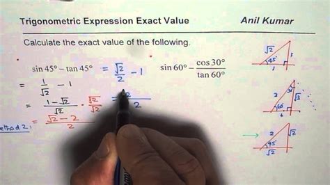 Web trigonometry find the exact value cot (60) cot (60) cot ( 60) the exact value of cot(60) cot ( 60) is 1 √3 1 3. Now, the sine of 18 degrees comes from the sine of half of 36. 1 √3 1 3 multiply 1 √3 1 3 by √3 √3 3 3. Web how to find the exact trigonometric values: Check the quadrant to determine. Web faqs on finding exact value calculator note down, the function that was given in the problem. Web trigonometry find the exact value cot (60) cot (60) cot ( 60) the exact value of cot(60) cot ( 60) is 1 √3 1 3. Web find the value df.loc[df['first_name']=='mihir'] share. Step 2 split into two angleswhere the values of the six trigonometric. Determine which quadrant the angle is in (sketch the angle if needed) show more. Use special triangles or the unit circle.