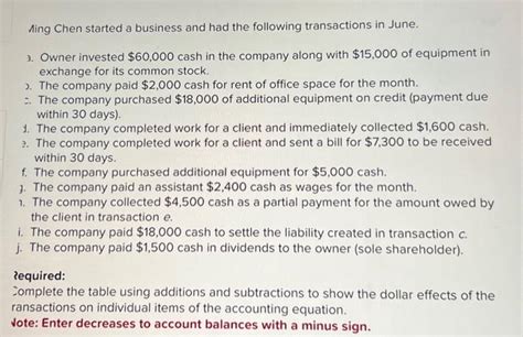 Create the following table similar to exhibit 1.9 and use additions and subtractions to show the dollar. Web during june, ming chen (the owner) completed these transactions.owner invested $61,000 cash in the company along with equipment that had a $22,000 market. Web ming chen started a business and had the following transactions in june. Web the company completed work for a client and immediately collected the $2,500 cash earned. Identifying effects of transactions using the accounting equation lo p1 ming chen started a business and had the following transactions in june. Owner invested $60,000 cash in the company along with $15,000 of equipment in exchange for its. Owner invested $64, 000 cash in the company along with $20, 000 of equipment in exchange for. Web ming chen started a business and had the following transactions in june. Web ming chen started a business and had the following transactions in june. Owner invested $68, 000 cash in the company along with $19, 000 of equipment in exchange for. Web ming chen started a business and had the following transactions in june.